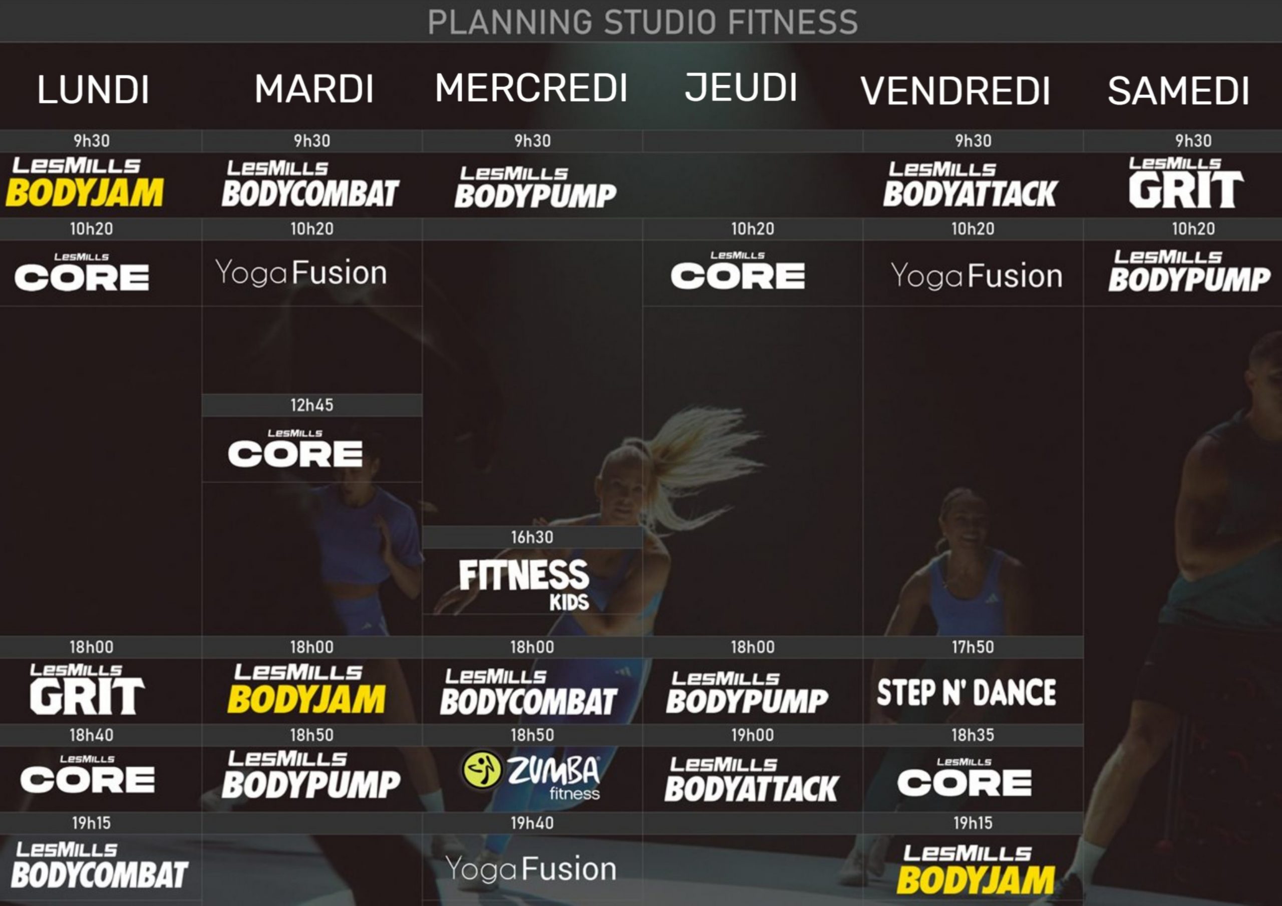 En associant les meilleures musiques du moment avec des exercices à la pointe de la science, la motivation et l’énergie du groupe, les cours collectifs de fitness LES MILLS™ vous feront adorer le fitness. Découvrez ci-dessous notre éventail de cours de fitness de classe internationale.